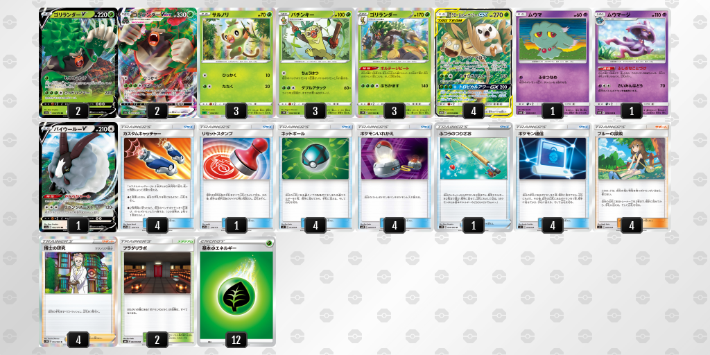 ポケカ店舗大会で優勝したミュウVMAX・ミュウデッキVのデッキレシピをまとめ&解説!他VMAXデッキレシピはこちら。 ミュウvmaxデッキはポケモンカードゲームに収録されている21年の『ミュウvmax』から多数登場しました。 ミュウVMAX デッキ ここでは「ミュウデッキvmax」のカード効果デッキタイプ :ミッドレンジ / 非GX/V 「ワタシラガ」の 特性:わたはこび と「チェリム」の 特性:はるらんまん で「レジドラゴ」にエネを安定供給しながら、 ワザ:ドラゴンエネジー で毎ターン殴り続けることを意識したデッキ。 Vポケモン3体の 今回ははくばバトレックスVMAXデッキのご紹介です。 デッキレシピの紹介 メインカードの紹介 はくばバドレックスVMAX 無無 エンペラーライド 10+ 相手の デッキ研究所 水タイプポケモンのデッキレシピ ラプラスVMAX